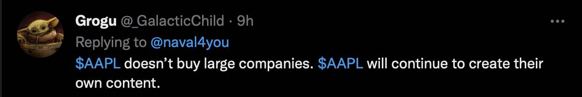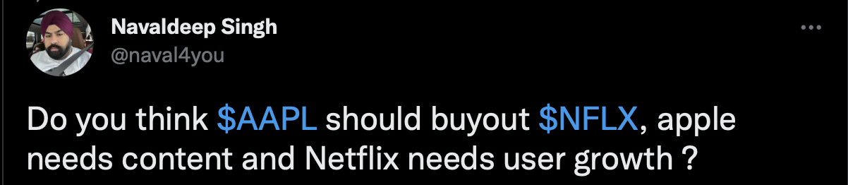 Apple recruits people that can fit into Apple’s corporate culture. Ditto for acquiring companies. Easier to integrate small companies into the Apple’s corporate culture. NFLX is too large and its corporate culture too different.