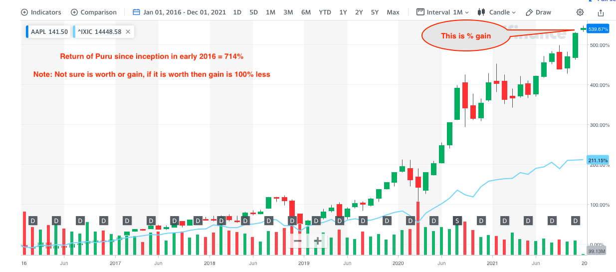 Return of Puru portfolio is ahead of AAPL. Please take note that without hedging it would be below AAPL. That is, his choice of stocks are not that great. His hedging skill is
