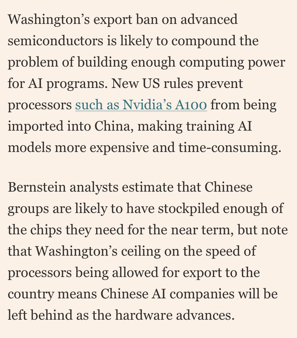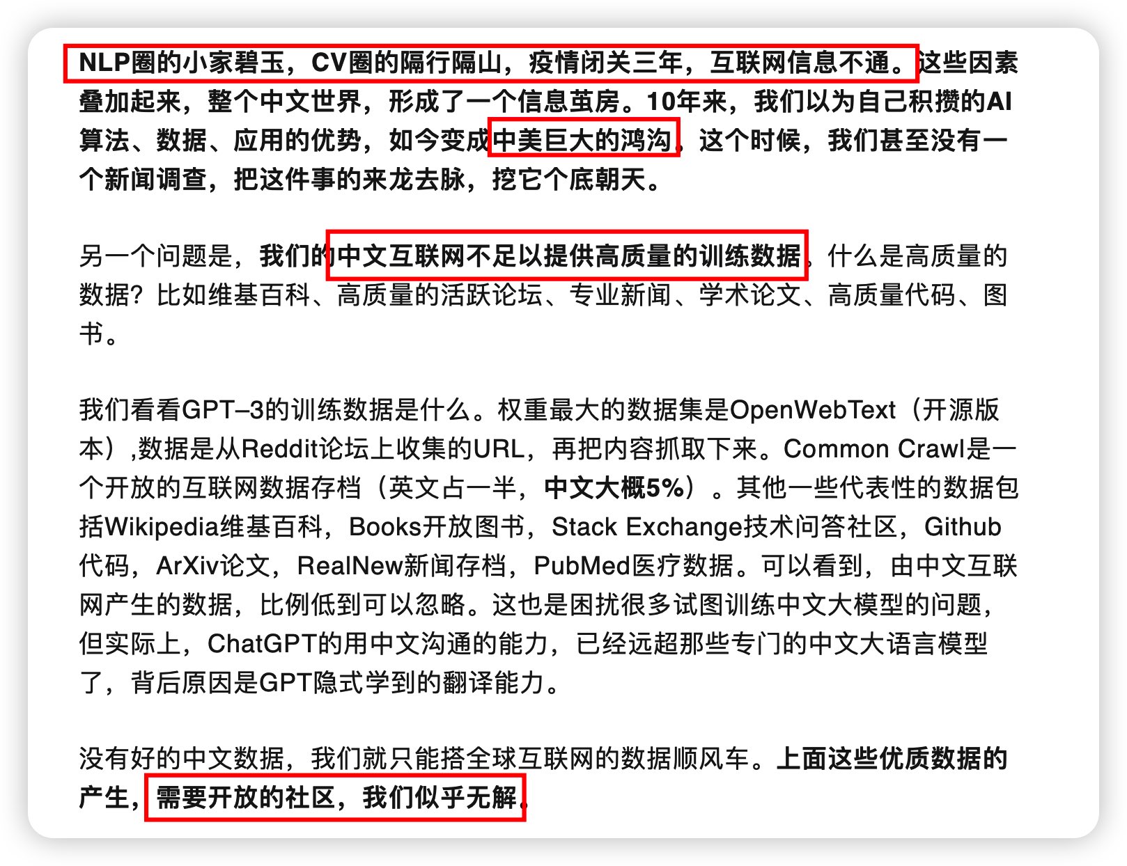 Basically it says chatGPT needs a lot of training texts, but China’s internet is heavily censored and thus lacks high quality open source text.