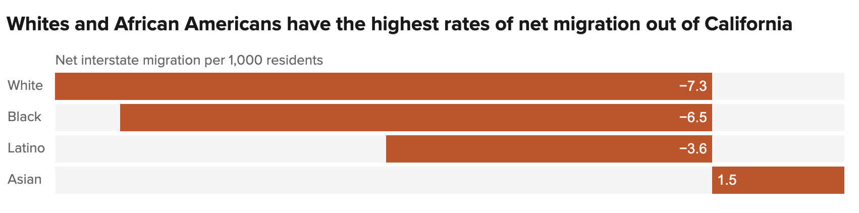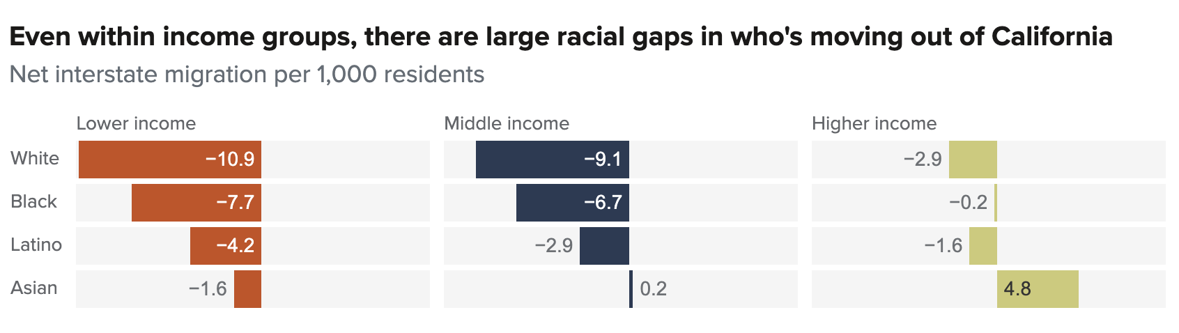 Cost of living is clearly a major factor, as lower-income members of every racial and ethnic group leave more often than they arrive. But there are large racial gaps even within income levels. For the lowest-income residents, whites have a much higher net flow out of the state (-10.9 per 1,000) than African Americans (-7.7), Latinos (-4.2), and Asian Americans (-1.6). At the other end of the spectrum, higher-income Asian Americans are notably more likely to move into the state than out of it (4.8 per 1,000). In contrast, higher-income African Americans are about equally likely to move into or out of the state (-0.2 per 1,000), while higher-income Latinos (-1.6) and whites (-2.9) are more likely to move out of the state.