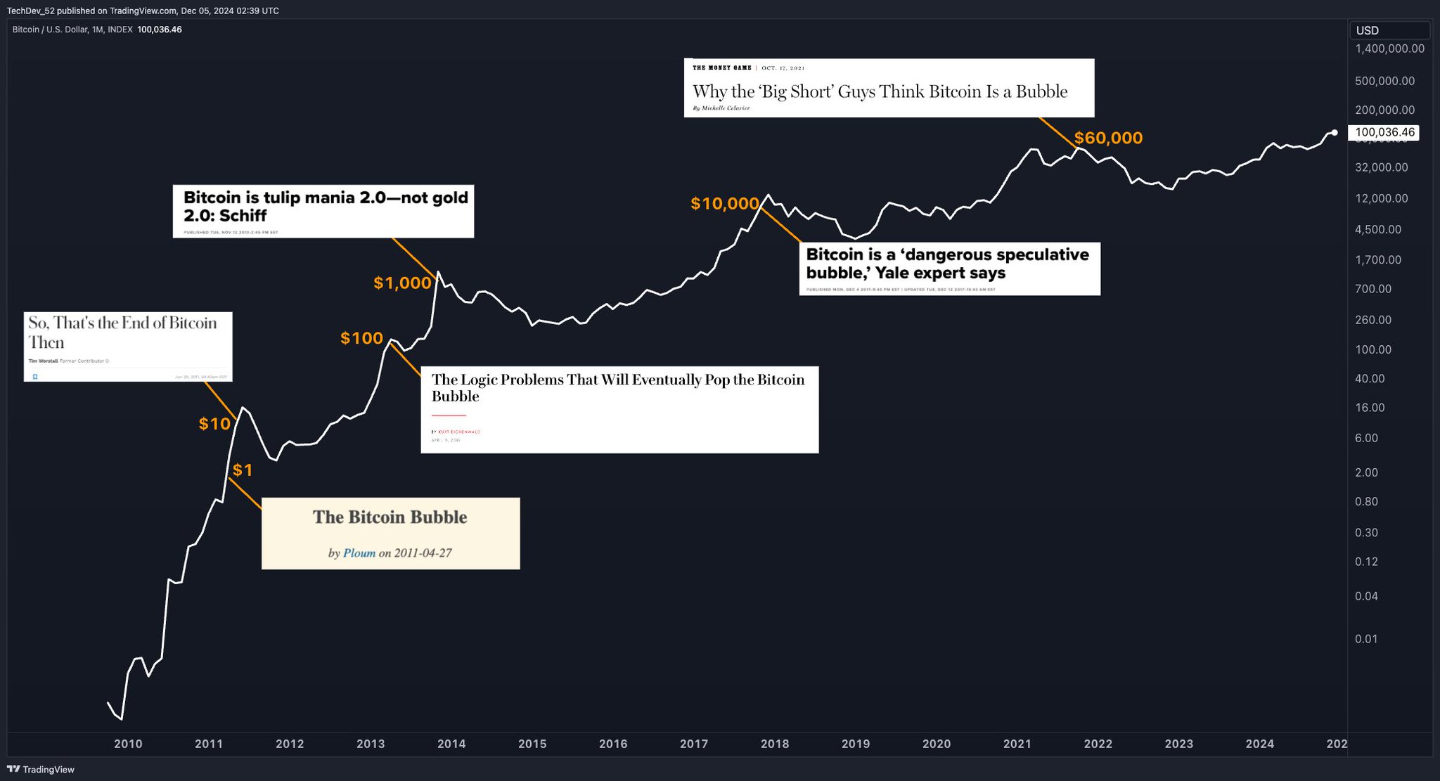 People keep saying Bitcoin is a bubble, starting when it was $1 a coin. And they will continue to say it now that it’s $100k a coin.