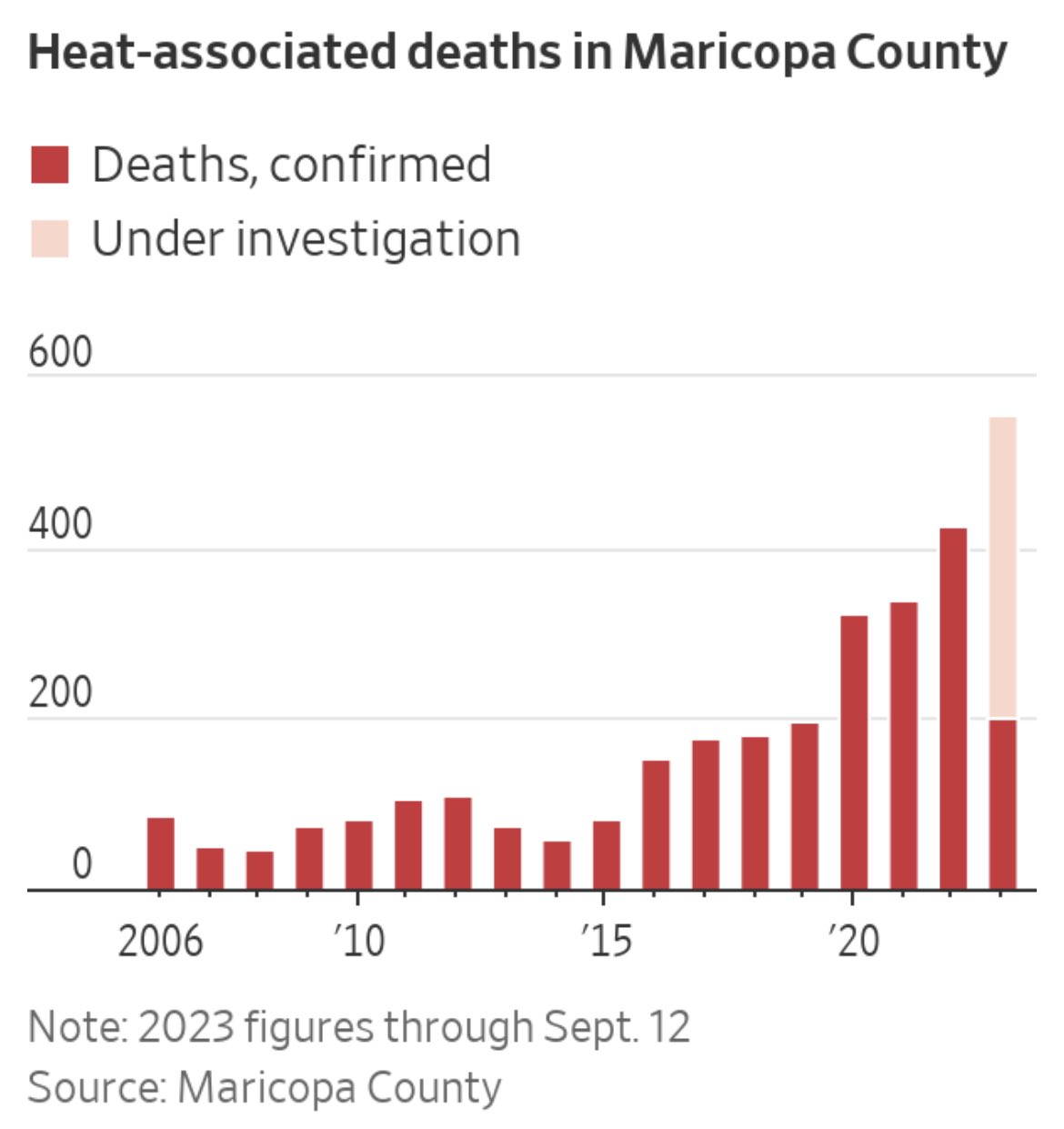 The problem is particularly acute in Arizona: The state endured an unprecedented 31 straight days above 110 degrees between June 30 and July 30. In the Phoenix area, a record 22 days in August exceeded 115 degrees.
