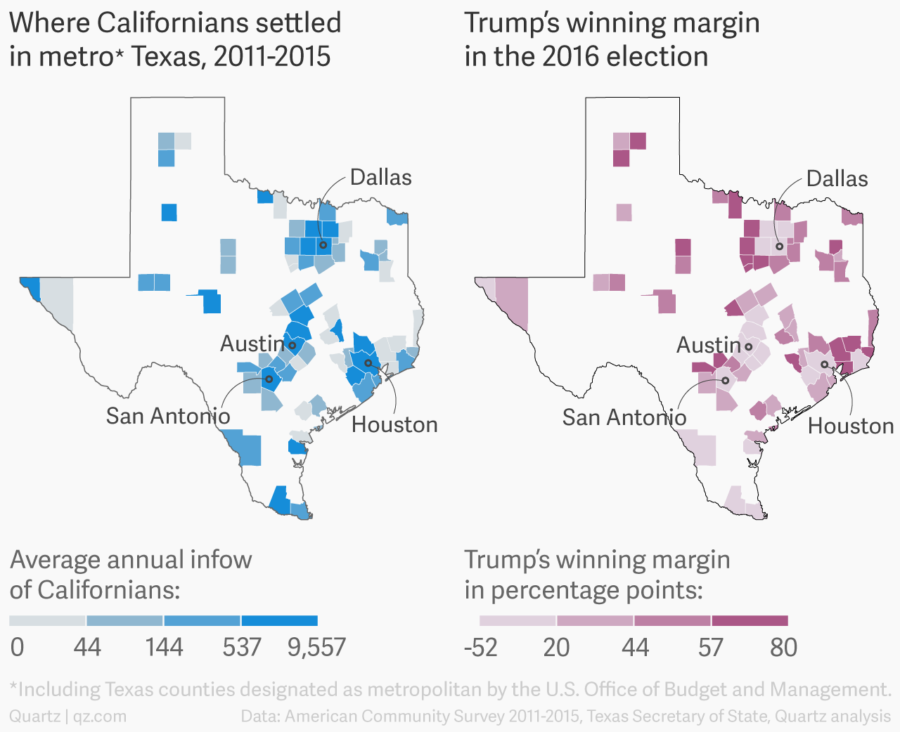 But the data also show Collin County is evolving along similar lines as San Bernardino. Its population has also swelled—at a much faster rate than in the California county. Over the past decade and a half, Collin, too, has grown poorer, less affordable and less Republican.