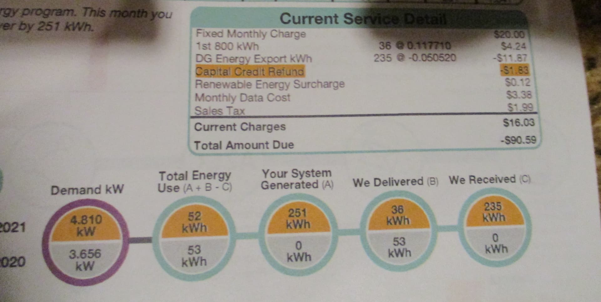 I may call the installer back and see about adding south facing panels. Due to free range cows and mule deer the panels would need to be elevated and thus would be susceptible to wind requiring substantial anchoring. This was the reason the installer gave for not wanting to do it but really I think it’s just that they’re not used to doing it and didn’t want the extra bother. Per my latest bill my production predictably plunged but I still generated 5x what I used. Despite that I failed to break even. This not only illustrates the importance of south facing panels but also the fact that solar really makes no sense when your usage is low. As stated previously I’m ahead on the system but just barely.