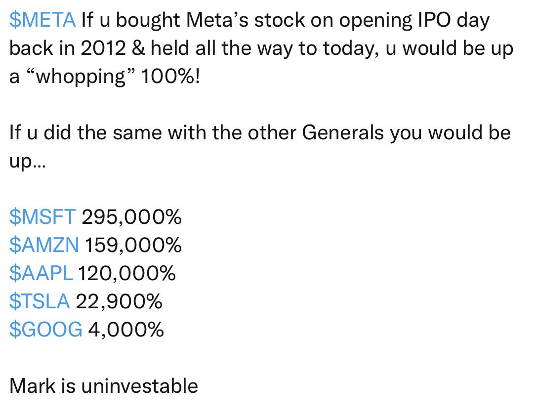 MSFT ipo-ed in the 70s. Most of those investors are now either dead or too old to enjoy their wealth. META’s IPO investors are still alive and kicking.