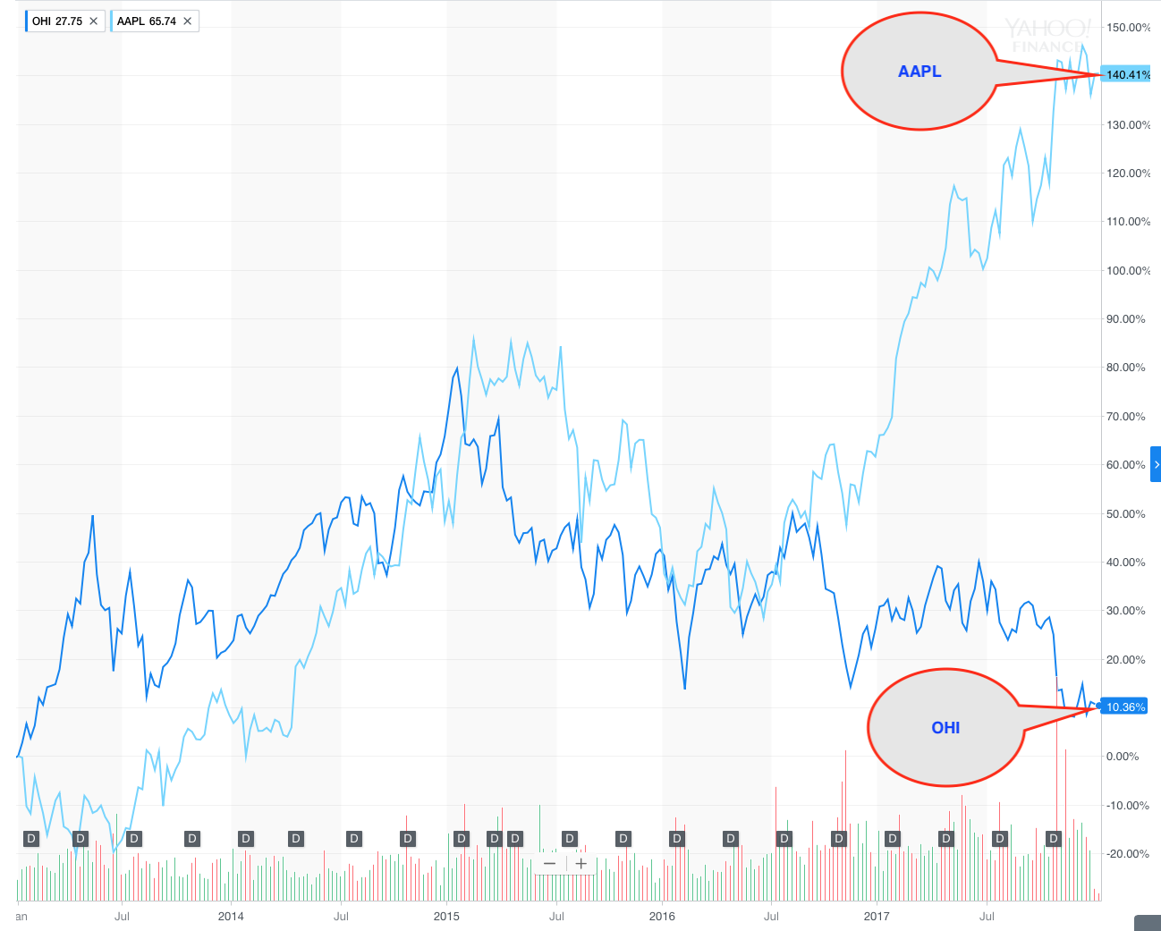 OHI a healthcare REIT pays $2.60, trading at $27.40 now.