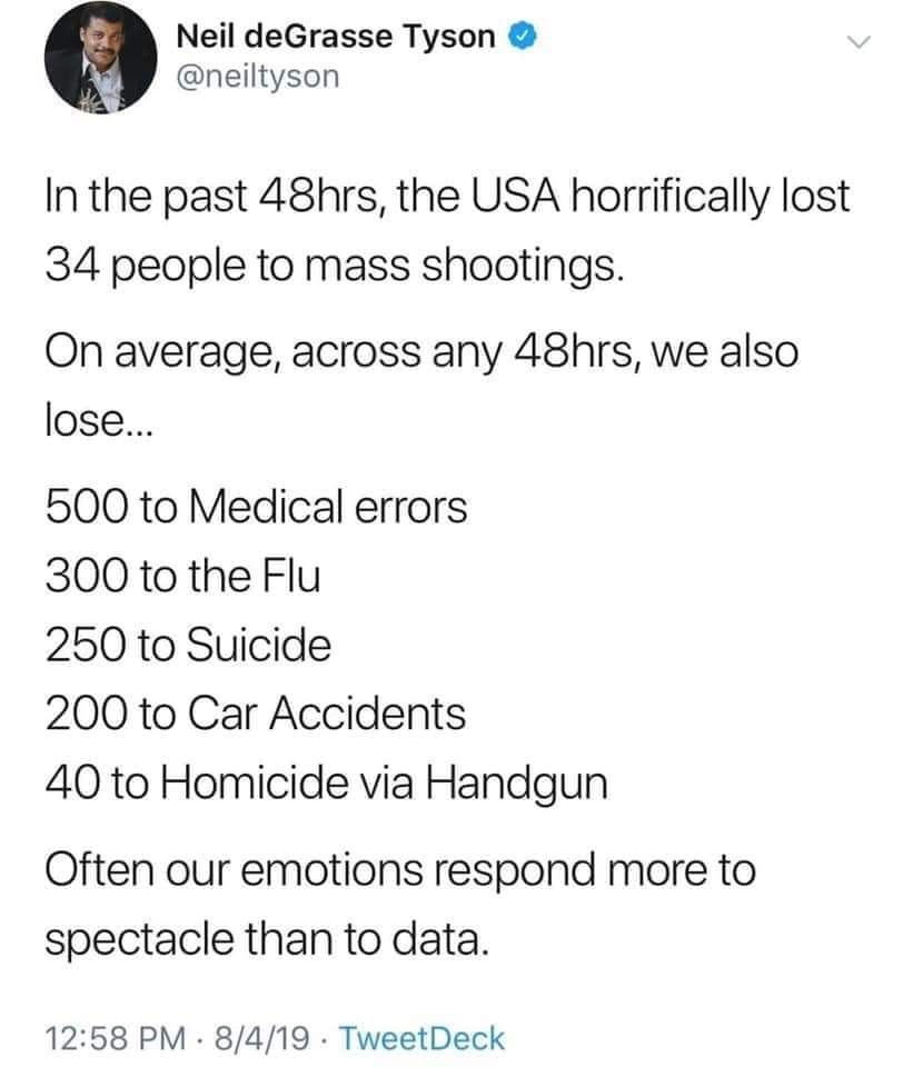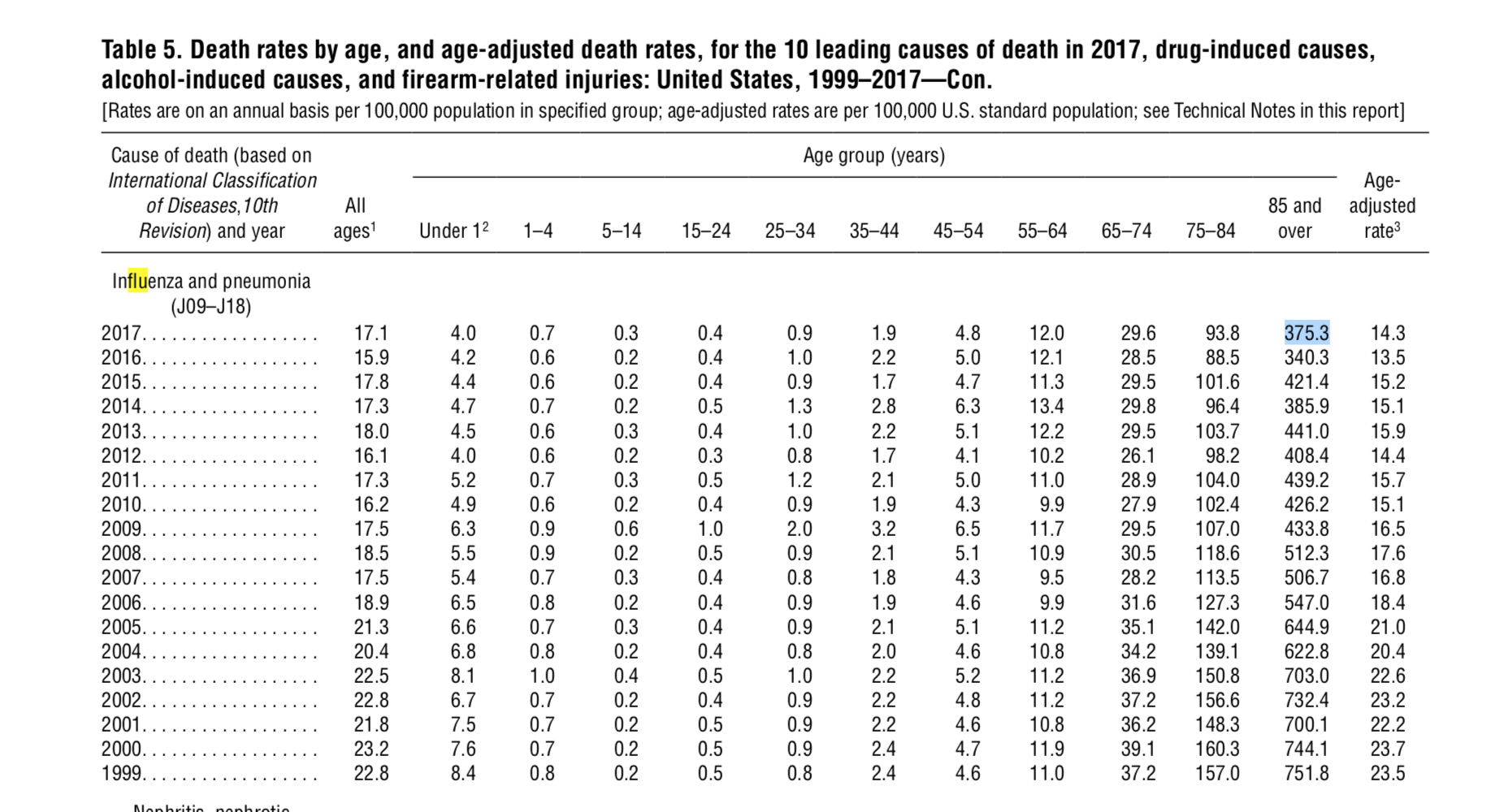 BTW: Interesting stats on the flu–the majority of people who die are over 75. So you’re also talking about death rates for very different age groups… I’m guessing that the majority of gun deaths as well as suicide are much younger people.