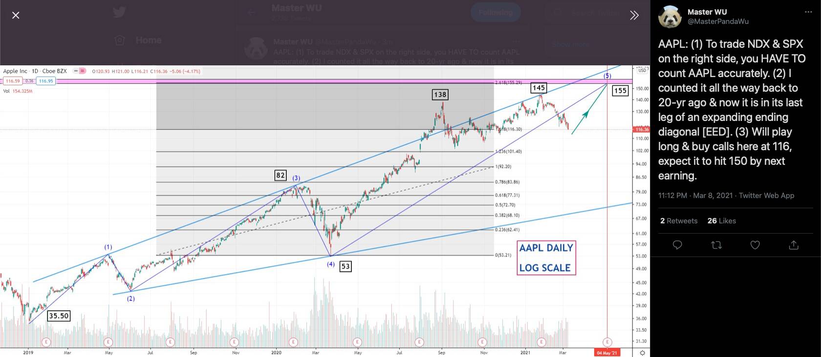 Panda also think AAPL would peak in May earning!!! That mean the big crash remains intact and would be triggered by AAPL earning DIVE! Estimated date of AAPL earnings is Apr 28… mark it down on your calendar. Liquidate all stocks before AAPL earning. By May actually mean before May 1!