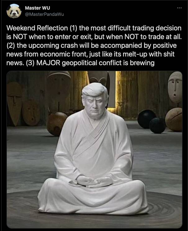 Agree with Panda that āwhen NOT to tradeā is difficult to do. Was thinking of liquidating all trading (not buy n hold) positions⦠patiently waiting for the final last leg⦠which unfortunately can last few months to 2-3 years⦠Yes, Panda could be right, GS/ Marko could also be right,⦠both could be wrong too⦠looking at the chart, is possible that century top is in (recalled it is already above my minimum price to call it a peak?)⦠very indecisive⦠monitoring is all I can do now⦠meanwhile subconsciously persuading my innerself to liquidate trading position.