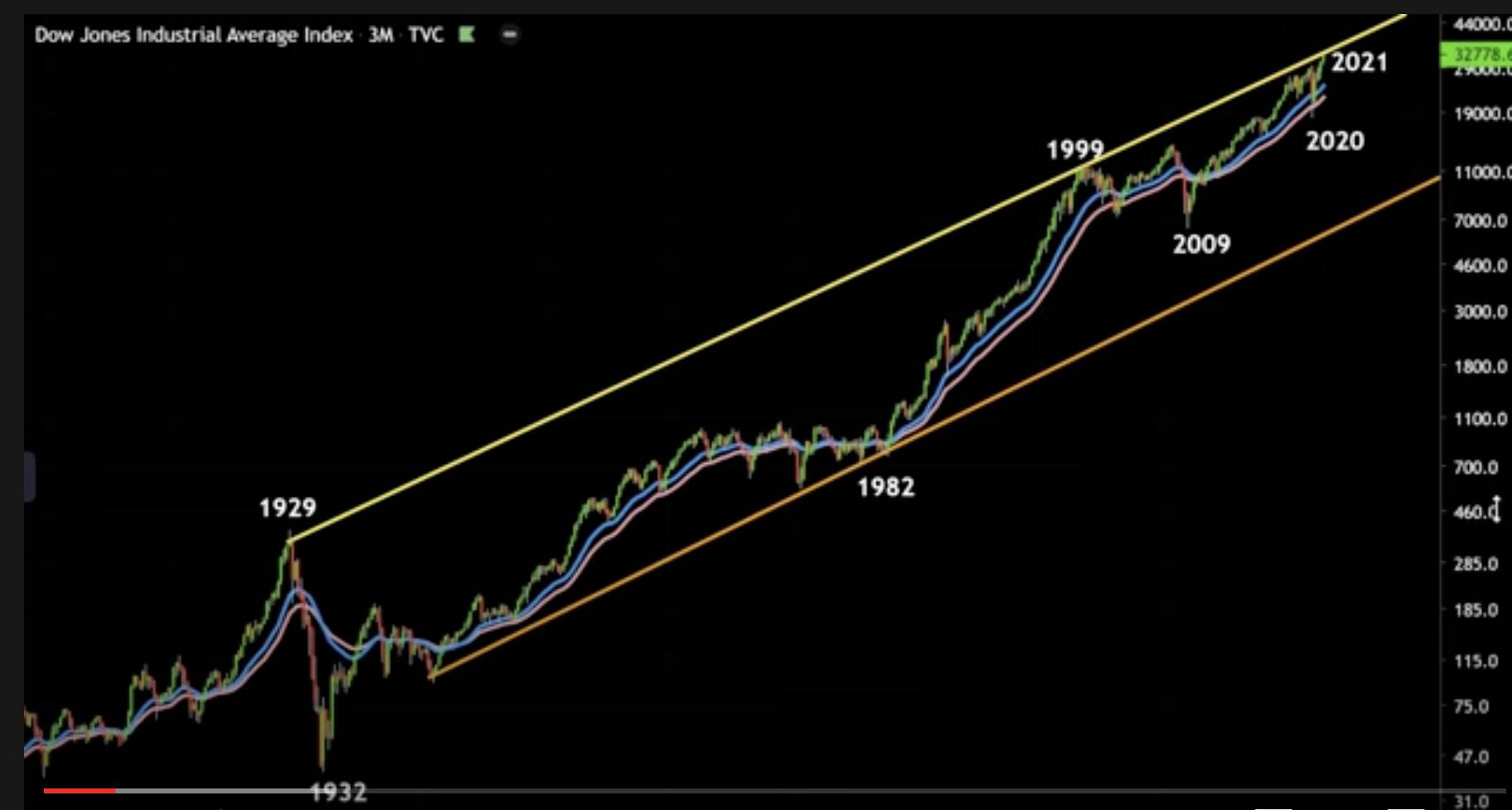 DJI chart. A century corrective wave is about to start. None of us including Charlie Munger and WB, have experience such as a corrective wave. Hold cash? Hold bitcoin? Ride through the ordeal? How to deal with a century corrective wave?