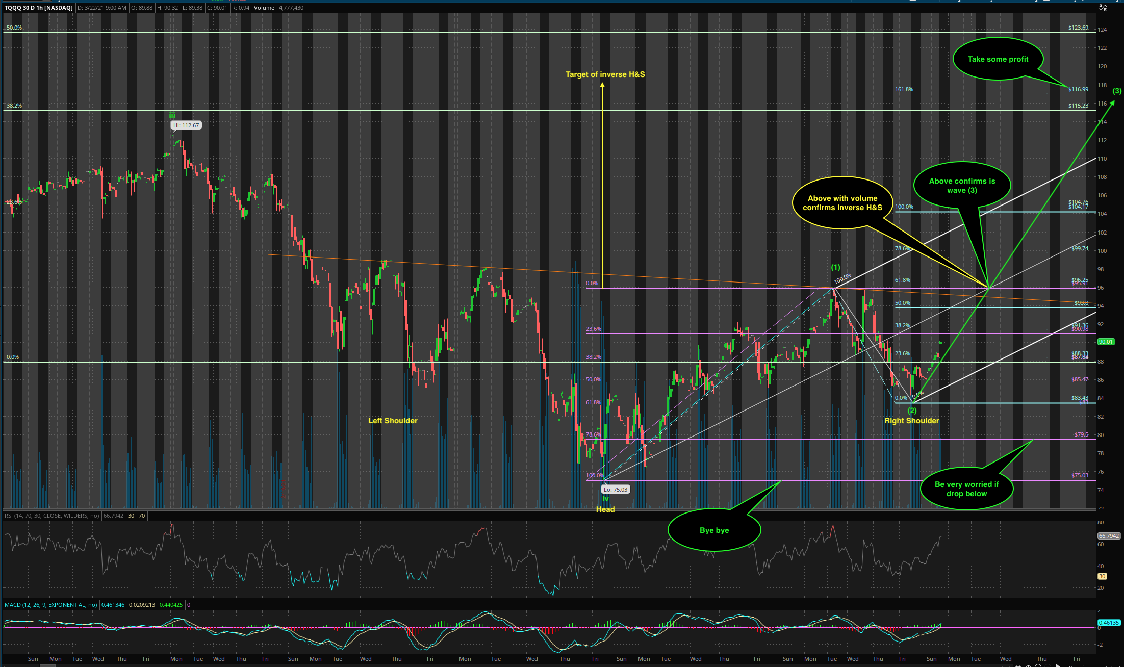 Below is the updated TQQQ 30 days hourly chart with annotations and a possible inverse H&S (by now, guess you know is a common pattern and its relationship with EW).