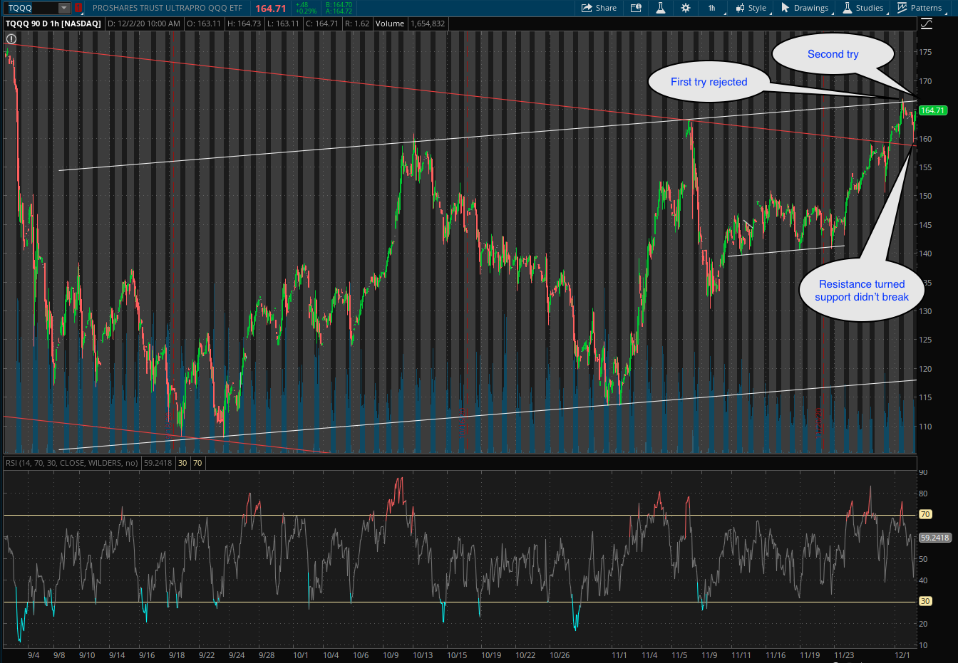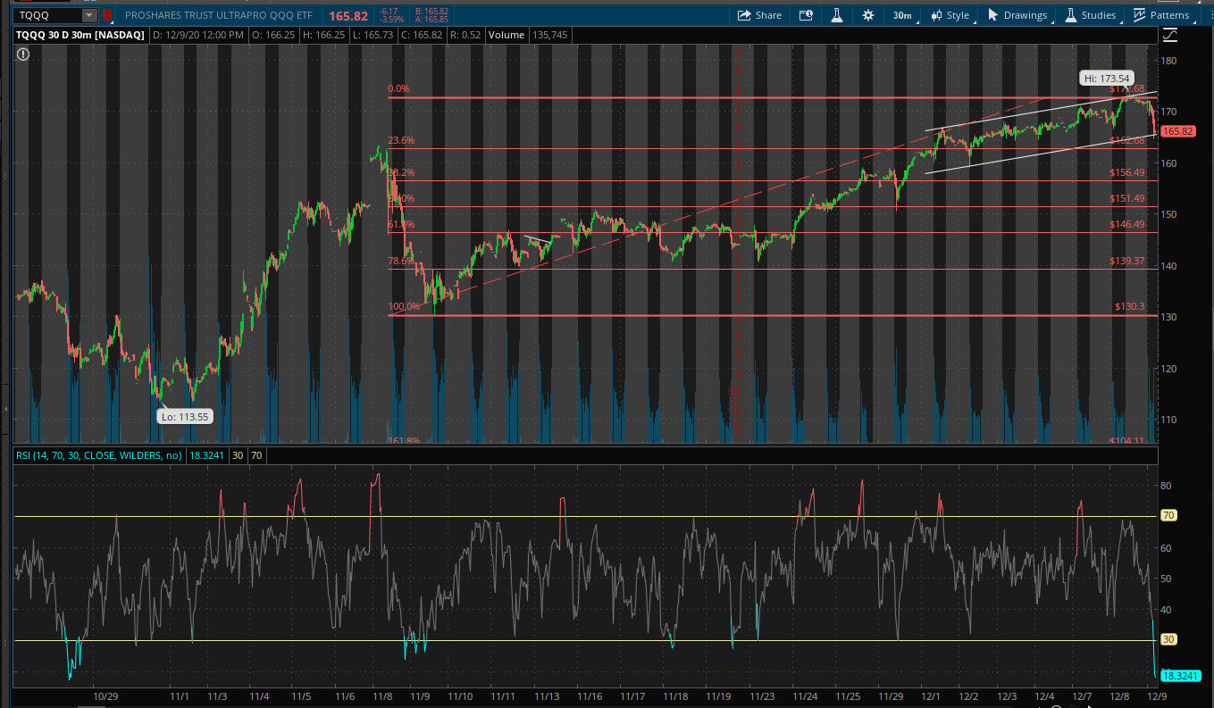 TQQQ hits the lower up trend line and very oversold in the 30-mins chart. Please donât forget I told you there is a bearish divergence in the daily chart which make an alternative count almost as valid as my preferred count.