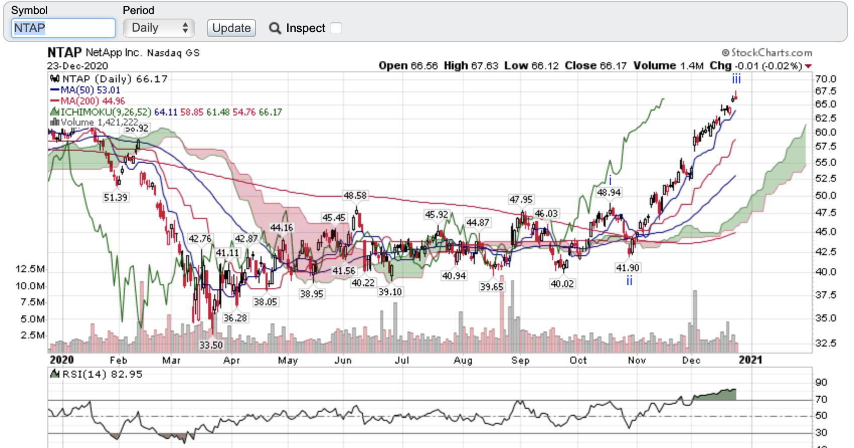 NTAP. Didnāt do a count. TA is bearish. Bearish gravestone and decreasing volume. Should close two gap ups till $60, depending on market conditions might attempt to close $55 gap.