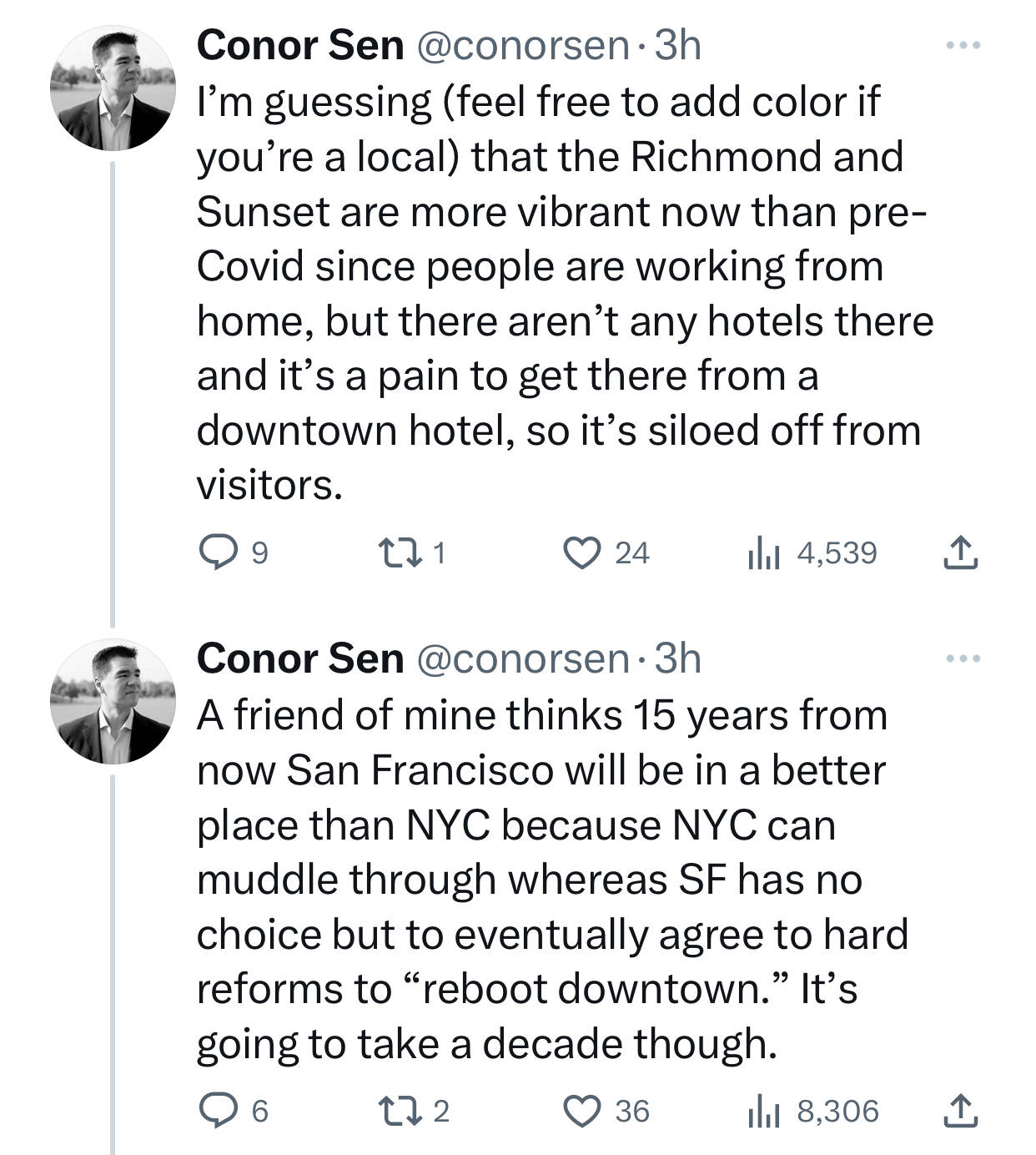 I touched on the same points but Conor put them in a neat little package. SF downtown is really lopsided in its development. All offices and no housing. So when WFH hits this skewed ecosystem collapsed.