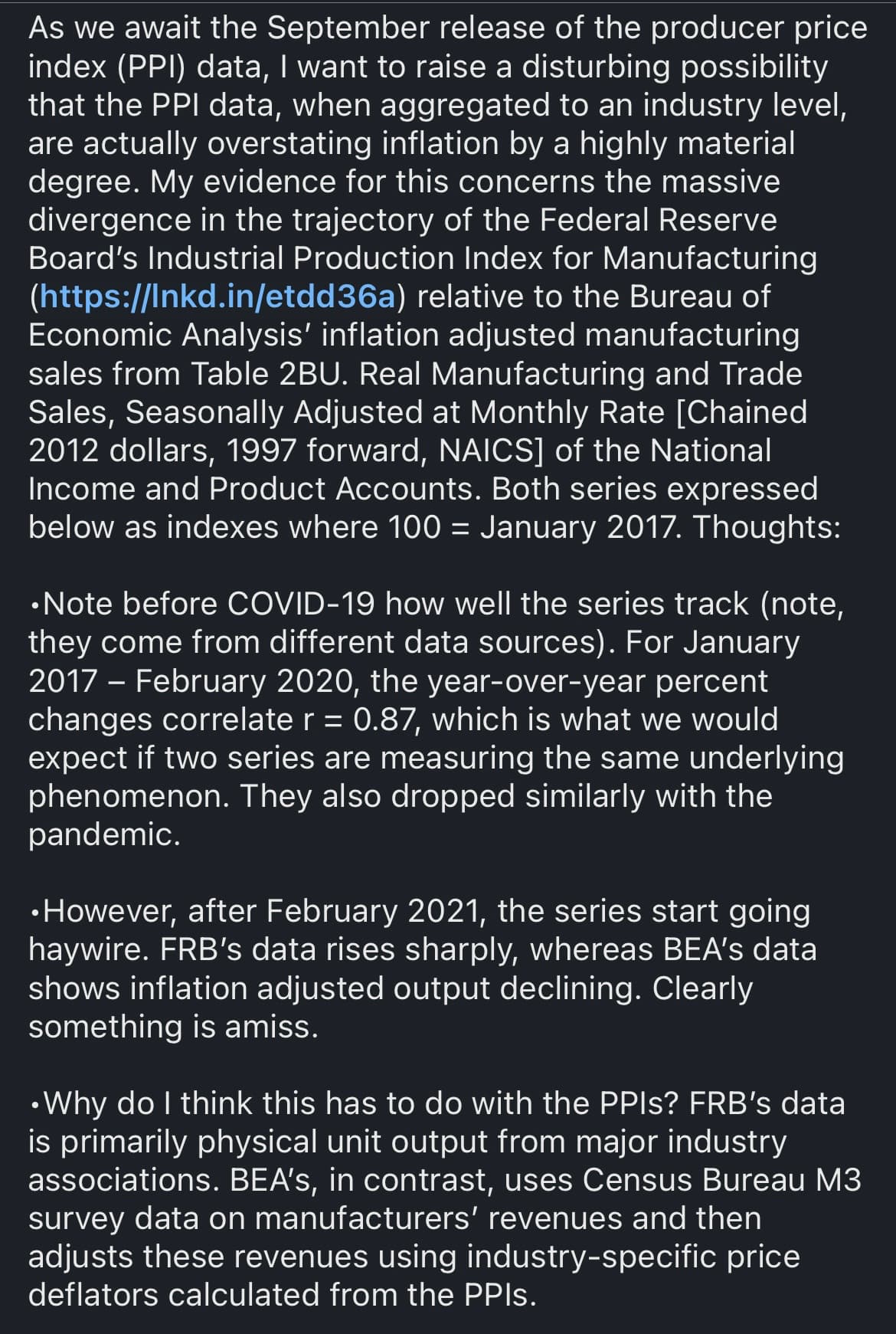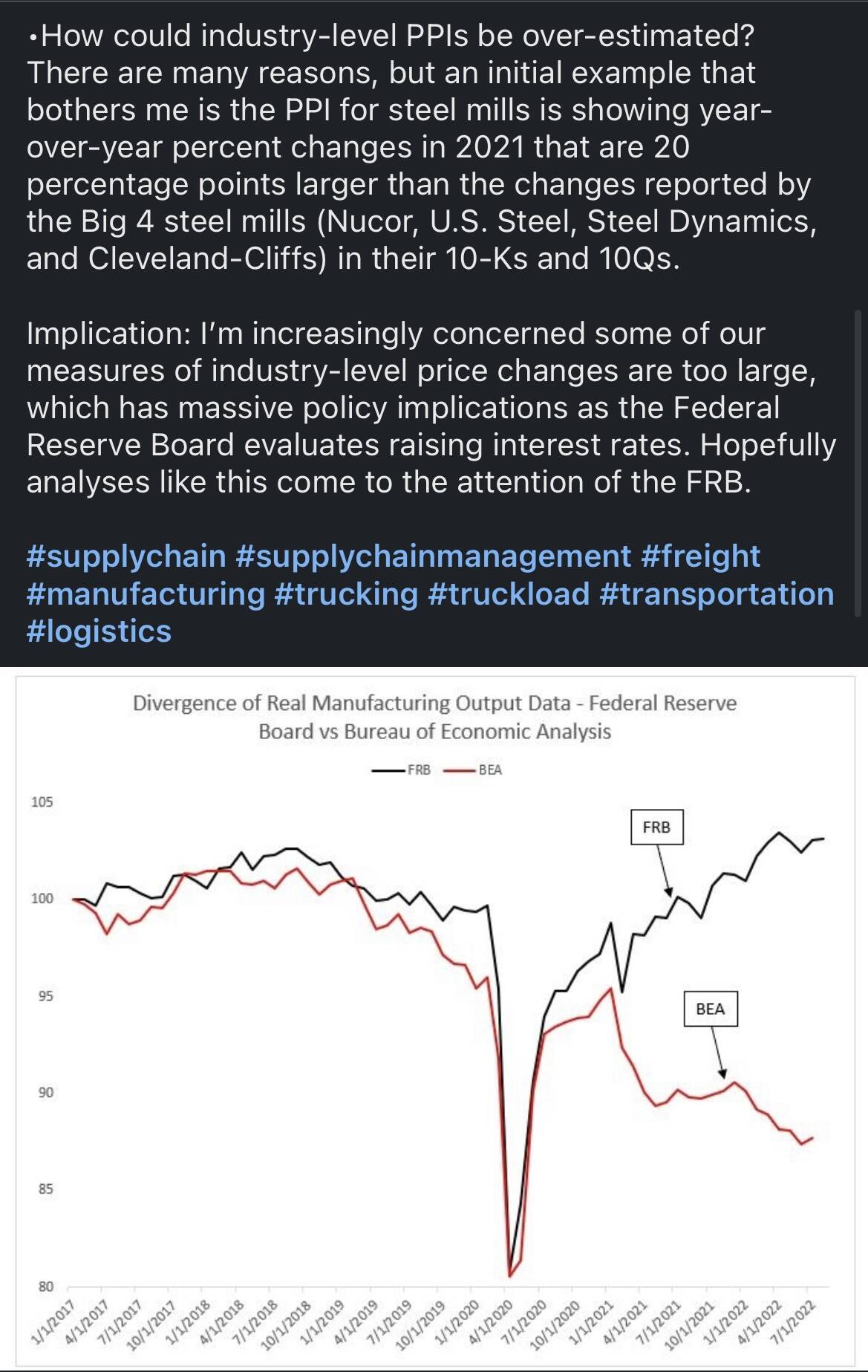 I think that’s what he’s doing. He’s pointing out that total output is falling while inflation is increasing and saying that can’t be correct. It is correct if companies are producing less units. That’s the whole point of supply chain issues. Less products are made due to constraints.