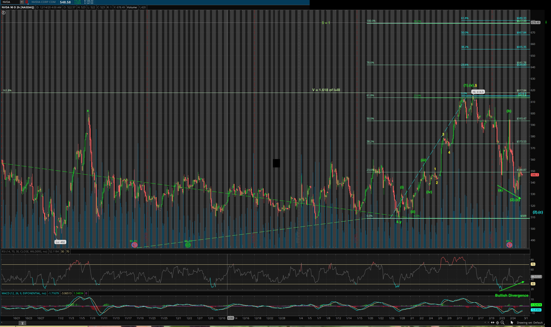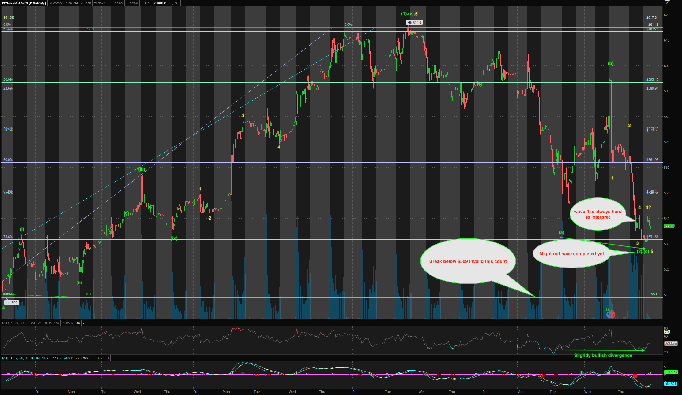 Bull count: So I’m taking a big risk to bet that $614.90 is merely a wave (1) and now in wave (2) corrective wave (in common term, pull back). Wave (2) might or might not be completed as wave 4 (in yellow) is notoriously hard to read (usually you know only when it is over). I bet on bull count because I am not aware of any business reasons for NVDA to go into a multi-year bear market given that economy is opening and it will soon acquire ARM… I might be wrong about the business (may be @manch can enlighten me).
