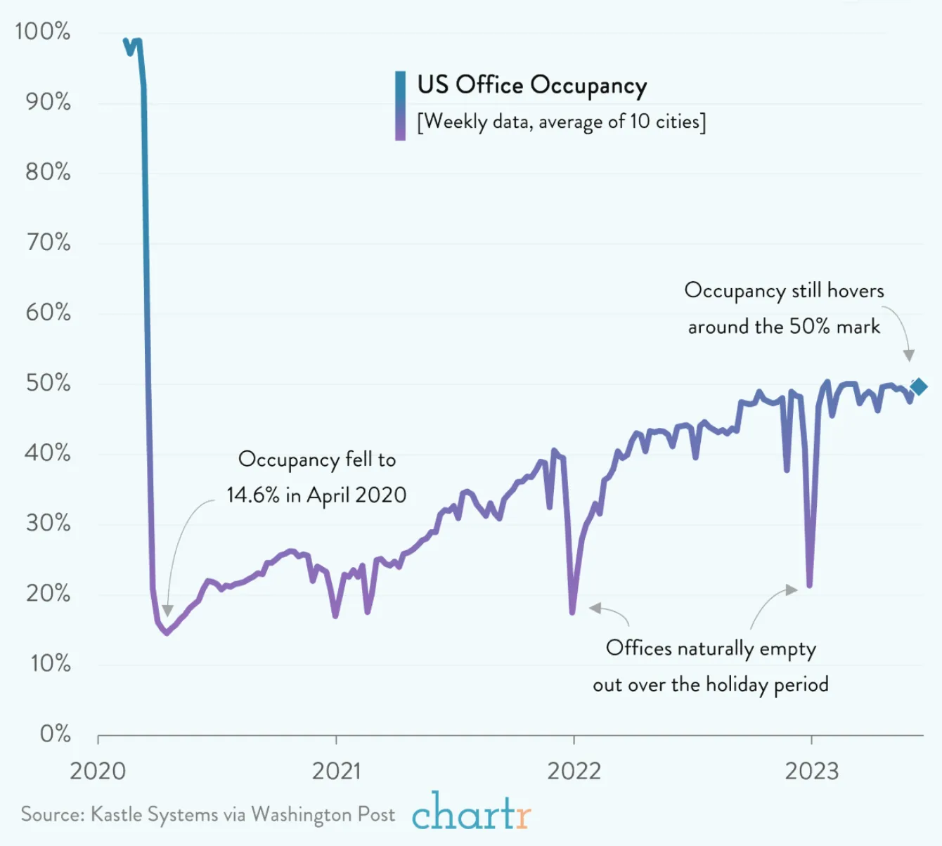 has seen its office-occupancy rate fall from 68% in early March to 57% last week — the biggest drop by far among the 10 major US cities tracked by security firm Kastle Systems.