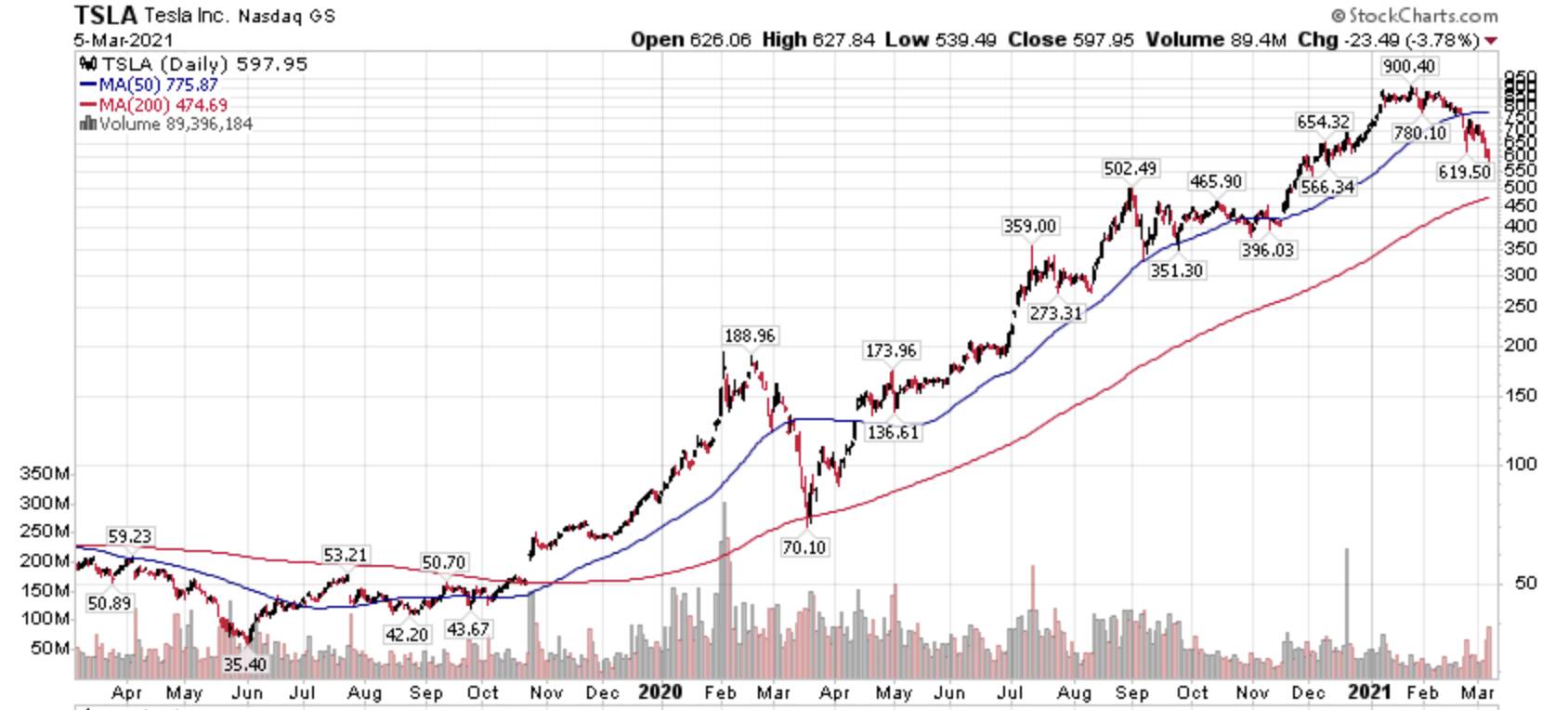 I may be tempted to buy some TSLA at $450… Nice round number 50% off $900 ATH. Or should I do some fancy Fibonacci number instead?