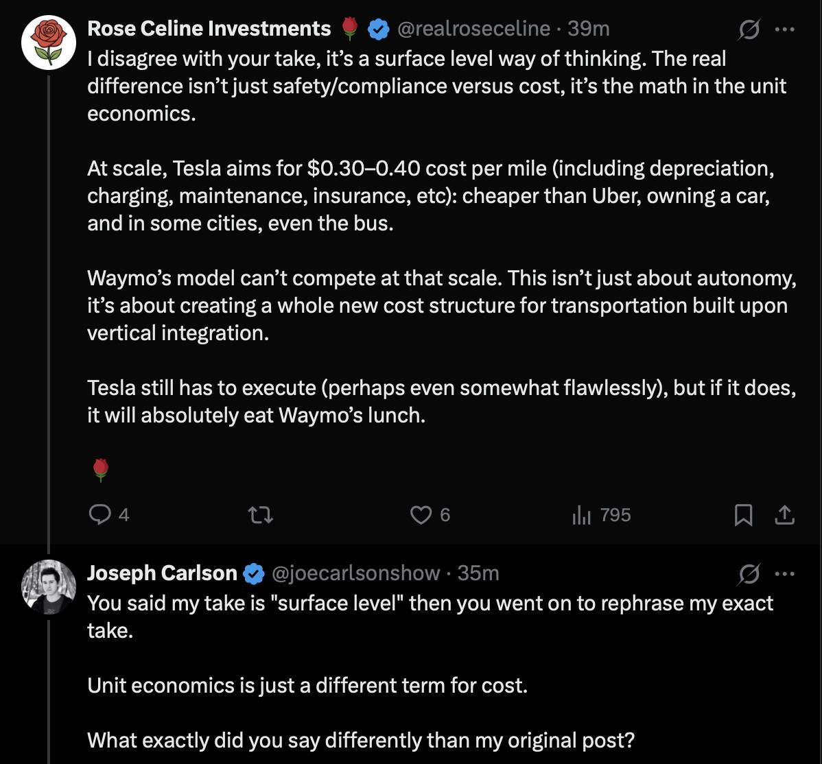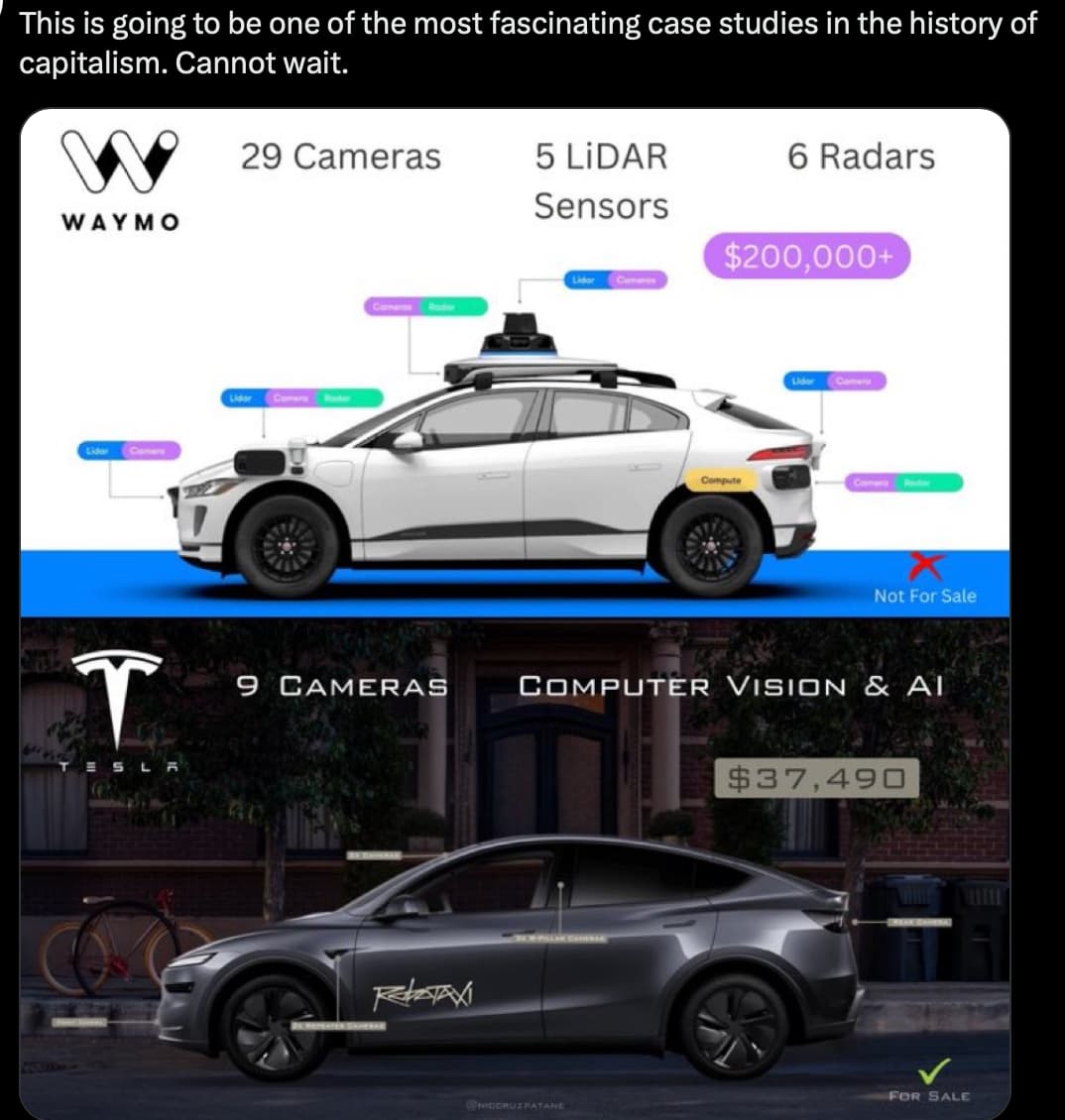 Capability-wise, Waymo is way ahead of Tesla. It’s premature to compare unit costs at this stage because Waymo is offering robotaxi for real at a big scale, and Tesla just driving its fans around with a dude sitting in front. If and when Tesla’s tech reaches parity with Waymo, only then can we compare costs. A bicycle is obviously cheaper than a car, not a meaningful comparison.