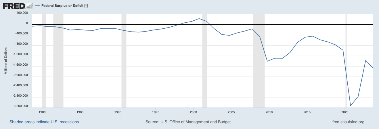 The 80’s and 90’s were characterized by falling inflation and falling interest rates. The deficit plunged thanks to the economic growth spurt started by Reagan and later the “peace dividend” from the collapse of the Soviet Union and surpluses in Social Security. The end of the bull market coincided with a bottom in gold - $350 an ounce.
