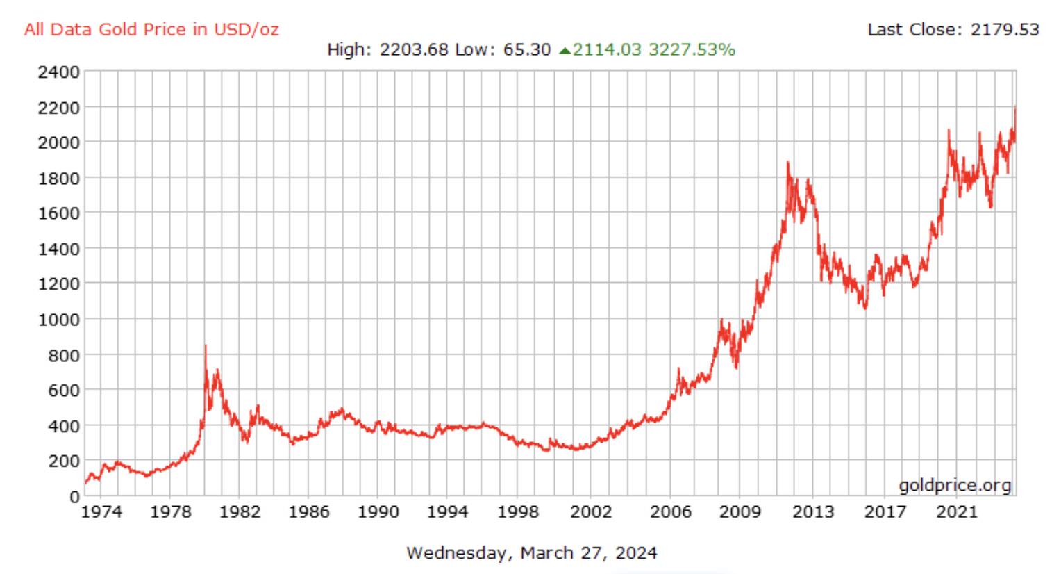 Here’s the history of gold price for the last 50 years. It got turbocharged by the introduction of ETF in 2004.