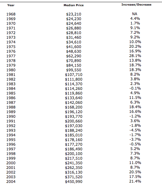 In 1970, California median home price is the same as US. But in 2004, California median is 2.4 times US median.