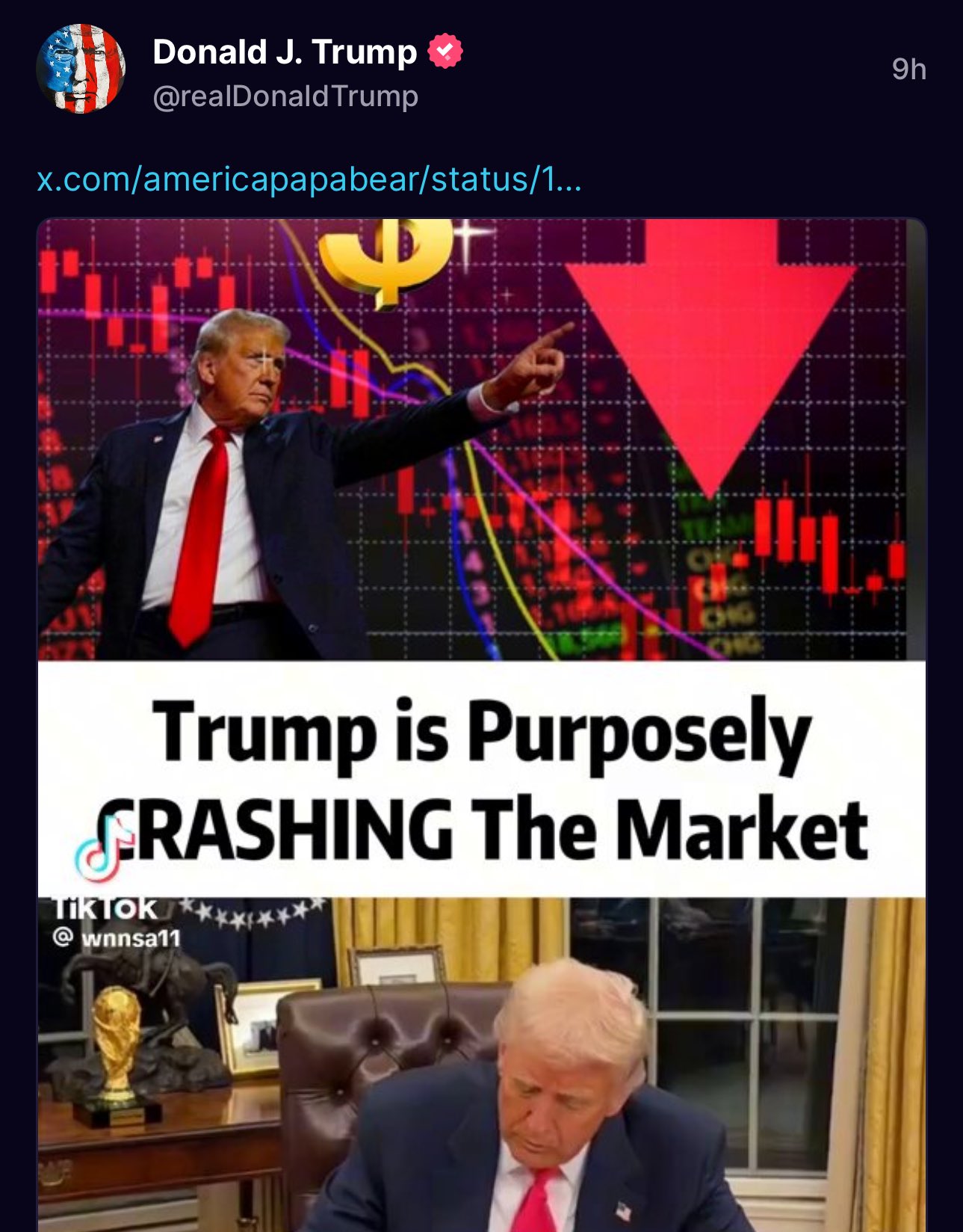 Trump reposted this tiktok. He takes pride in crashing the market.