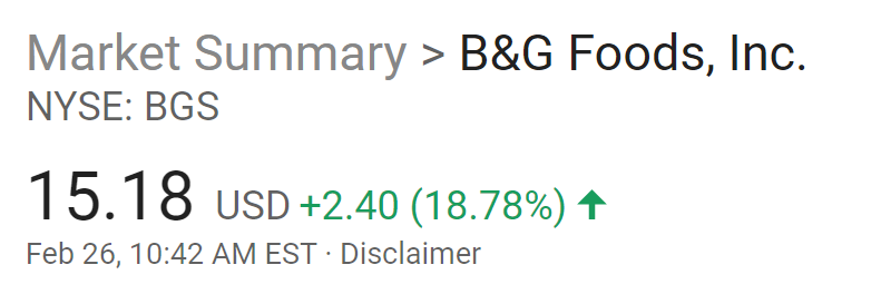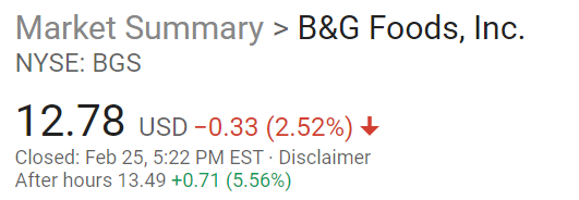 See the BGS food, I bought, is local market and has nice 14.5% dividend, went down way below and I bought at $12.81. It changed after results and after market to $13.5.