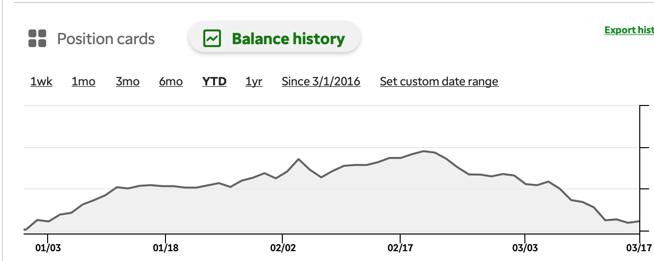 All cash. I even closed out the short puts at a loss instead of buying shares on Friday. They were more than offset by buying puts on other stuff, so YTD is +2.5%. I still think we go down further. I’ll probably buy some puts the next big up day. It made sense to cash in while VIX was this high, and puts are selling at a fat premium.