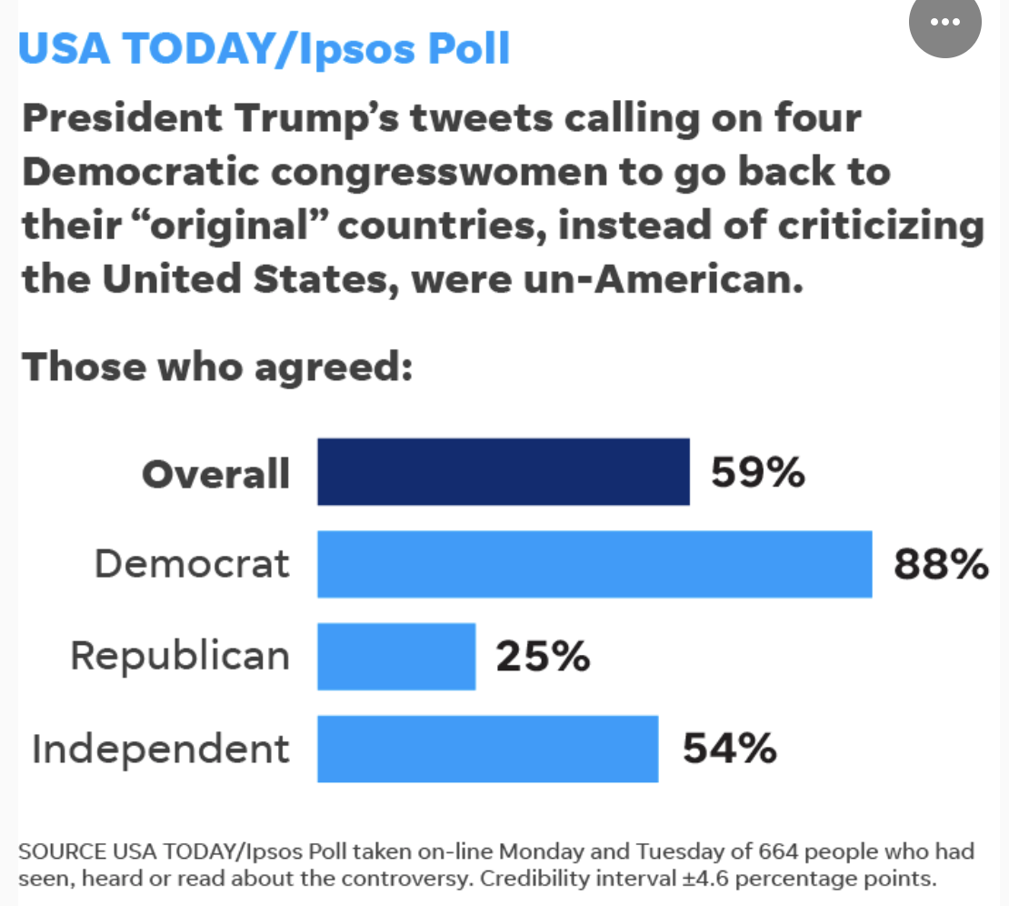 In a USA TODAY/Ipsos Poll, 68% call Trump's attacks on four congresswomen offensive, but most Republicans say they agree with him.